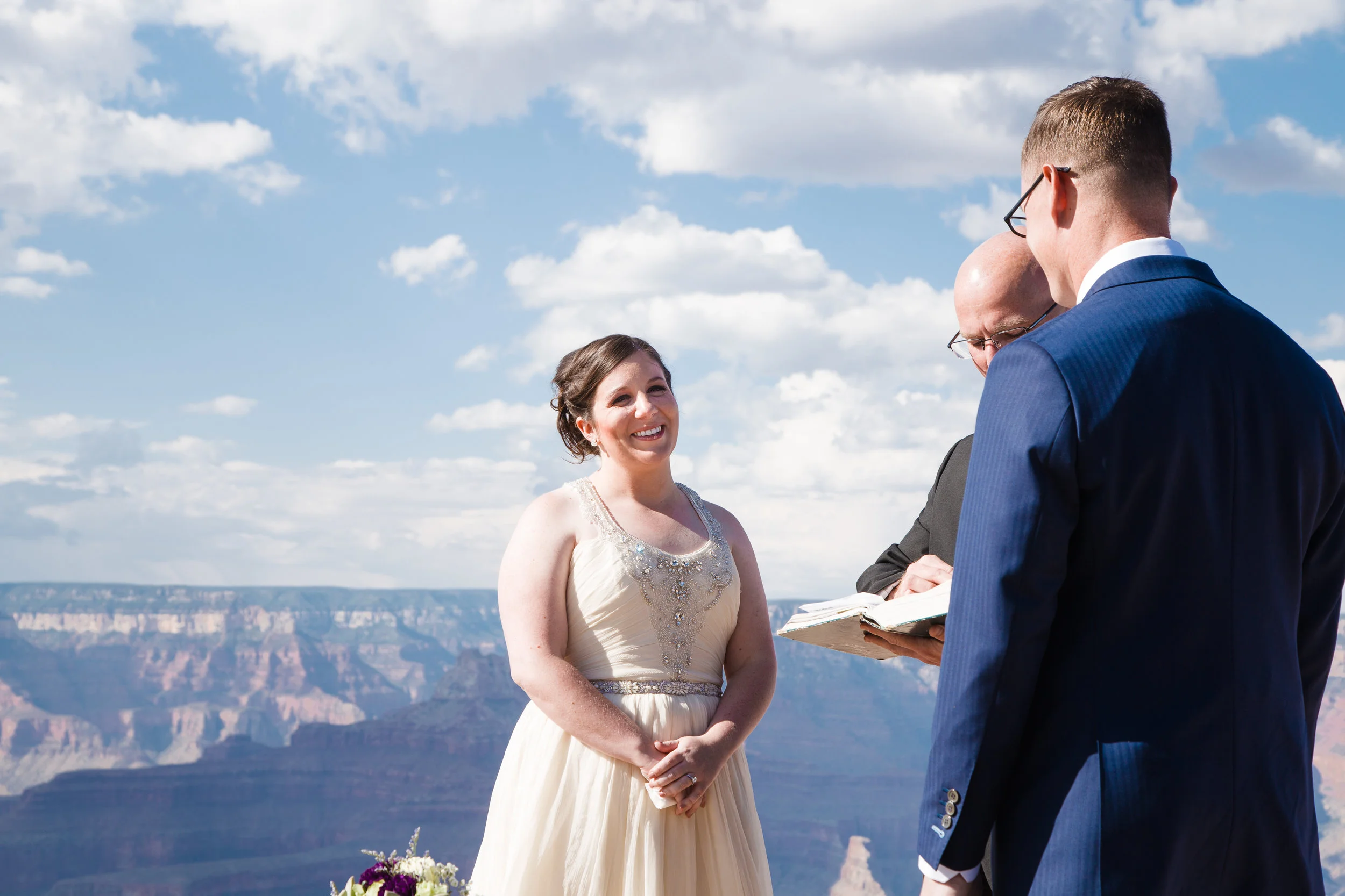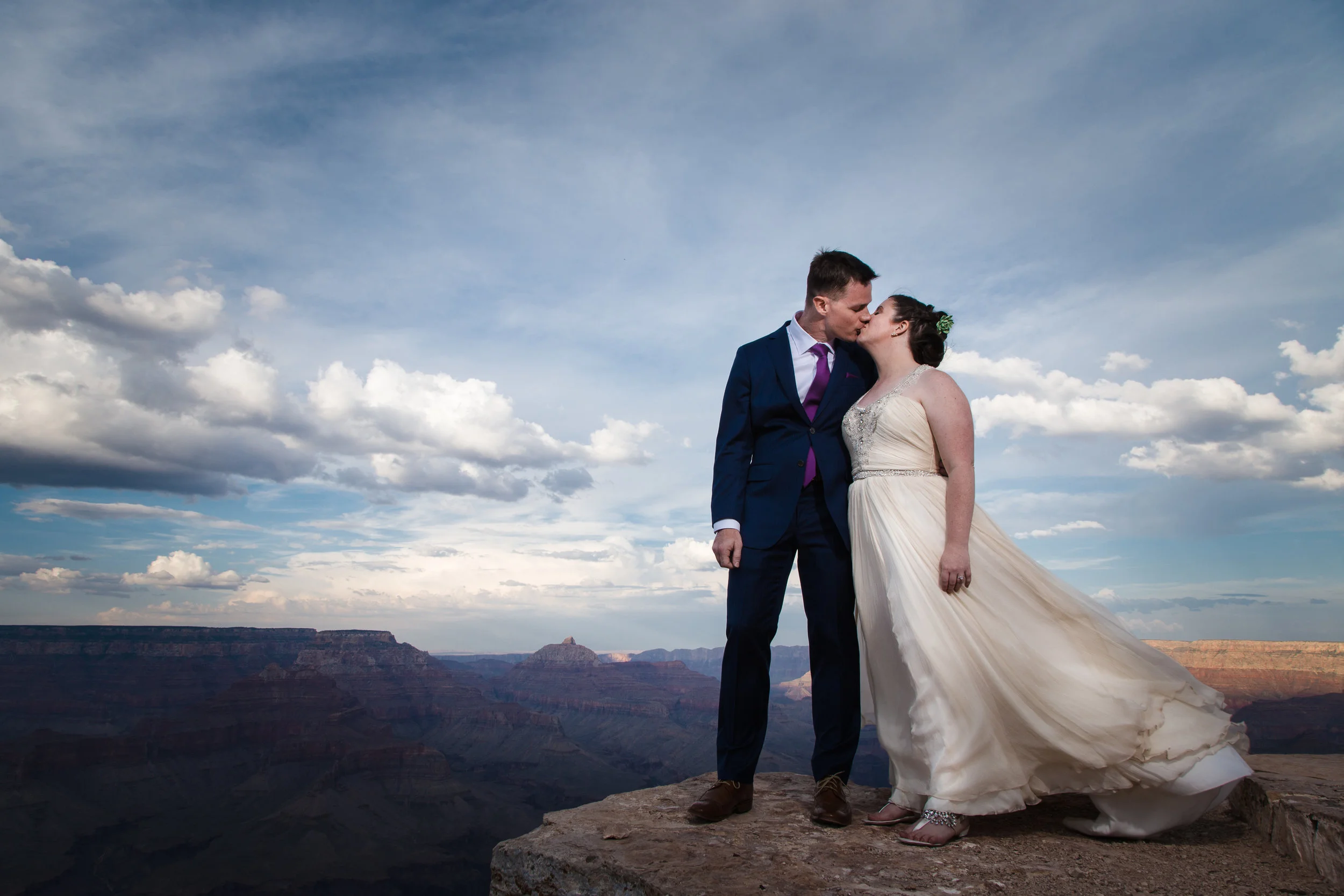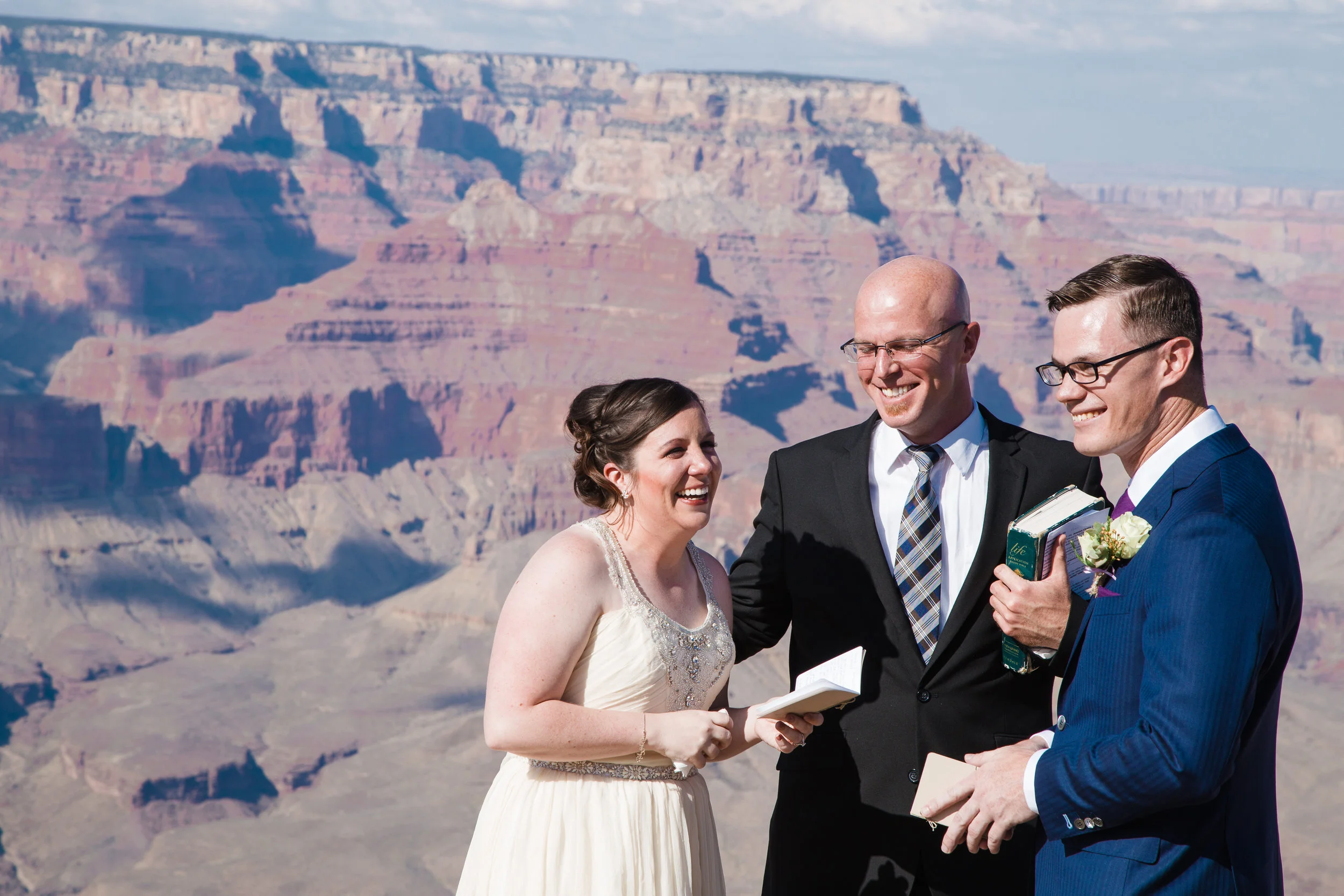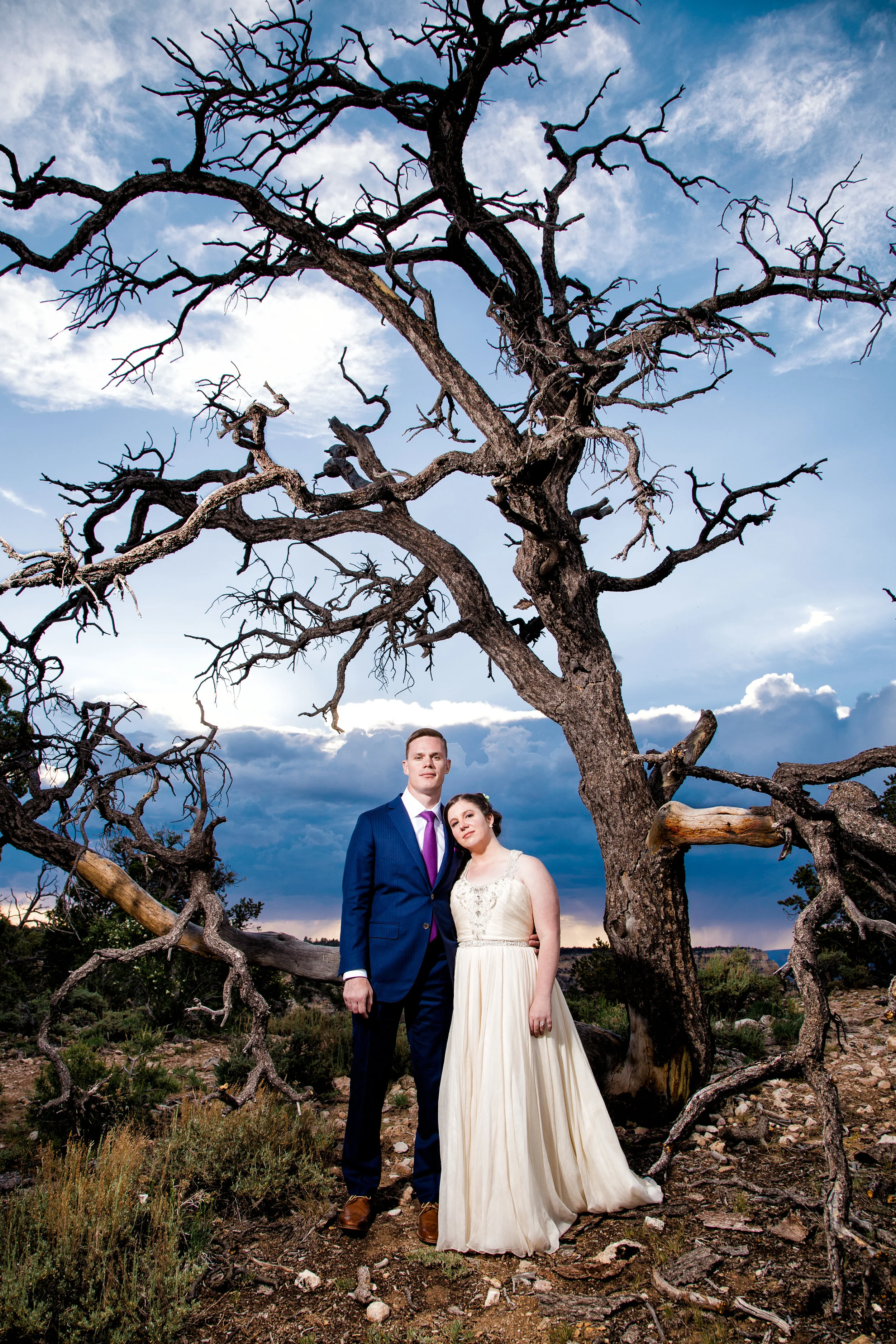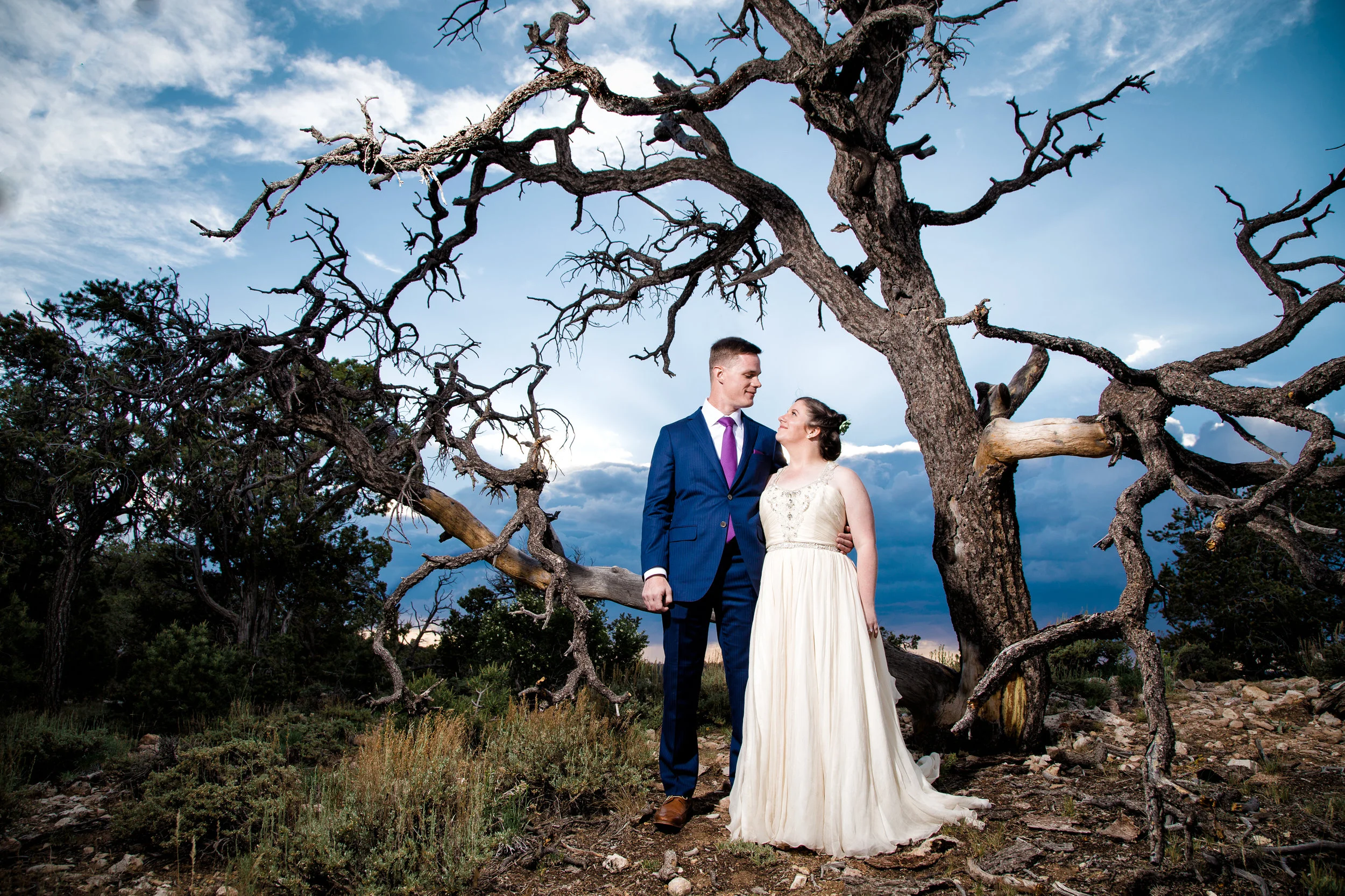 Christin and Jeremiah got hitched at Shoshone Point on the south rim of the Grand Canyon. It’s an epic spot and Christin wanted some epic photos of her wedding day. So that’s what we did! Jeremiah is a “bomb guy” in the U.S. Army. That is in no way a technical term for what he does, and isn’t meant to belittle the job in any way, but it does suggest he might have nerves of steel. And he was very calm and collected while getting ready to tie the knot. However, standing at the edge of the Grand Canyon isn’t super comfortable for everyone. Many people have a healthy fear of heights. Count Jeremiah as one of those people. But you would never know. He made it look effortless. Christin and Jeremiah’s wedding was beautiful and they were surrounded by loving and supportive friends and family. All in all, a fantastic day. Enjoy!